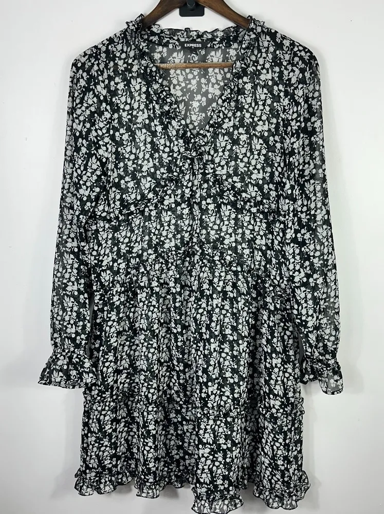 Express Black Floral Mini Dress Women M Cottagecore Coquette Fairy Romantic Adorable ruffled mini dress by Express in a sheer black floral chiffon with delicate white blooms. Features a feminine v-neckline with ruffle trim, long sleeves with stretch cuffs, and a smocked waist that flatters the figure. Perfect for date nights, garden parties, or layering with boots and a cardigan for a cottagecore or fairy-inspired look. Fairycore, Coquette, Cottagecore, Romantic, Soft Girl, Boho Feminine, Garden Party, Whimsical, Sheer Layers Condition: Excellent pre-owned condition. No visible flaws. Measurements: Length: ~33.5 in Pit to Pit: ~20 in Fabric / Made in: 100% Polyester (Sheer Chiffon) Made in Indonesia