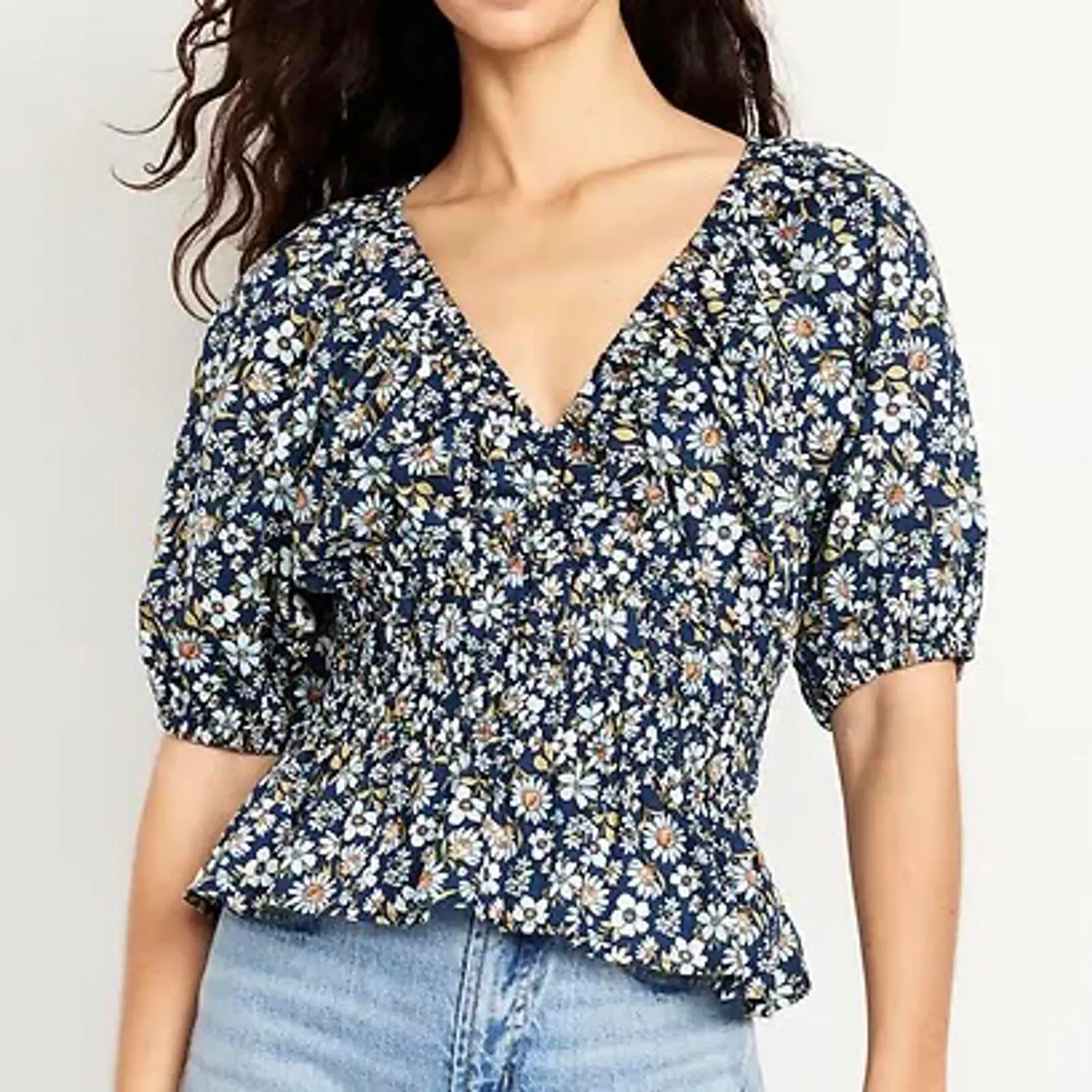 XSP 100% cotton deep v-neck short puff sleeves elastic cuffs smocked waist ruffled peplum hem relaxe... Show more