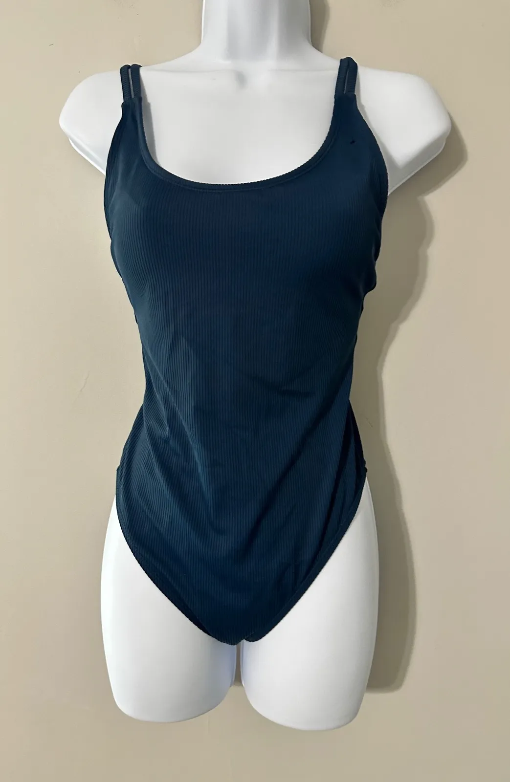 Cotton On Body navy blue one-piece swimsuit with a textured ribbed design. This stylish swimsuit features a flattering scoop neckline and double strap detailing on the back. Perfect for a day at the beach or lounging by the pool. Type: One Piece Department: Women Material: Polyamide, Elastane, Polyester Features: Stretch, Adjustable Strap, Comfortable Fit Swim Top Style: Athletic Pattern: Solid Accents: Strap Strap Type: Spaghetti Number of Pieces: 1 Piece Country of Origin: China Garment Care: Machine Washable Unit Type: Unit Keywords: swimwear, one piece, ribbed texture, scoop neck, double strap, beachwear, poolside, summer fashion, athletic, minimalist, vacation All items stored in polybags i ship within 2business days