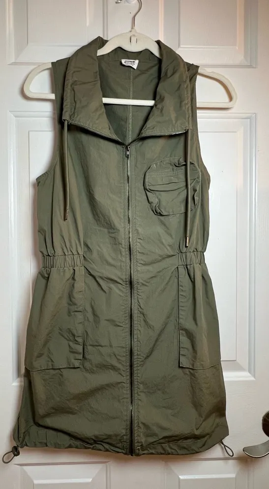Olive green dress with zip closure. Features drawstring collar and pockets. Size 8 Offers are Welc... Show more