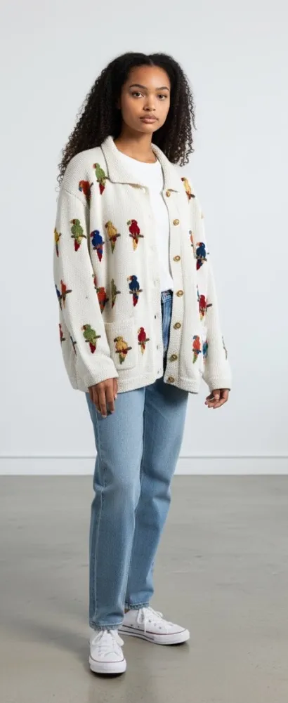This delightful knit cardigan features a vibrant parrot design, perfect for adding a splash of color... Show more