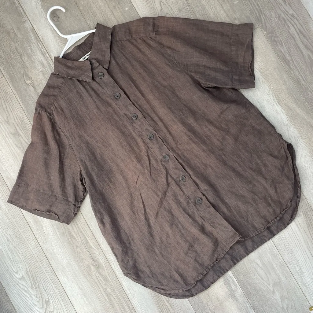 Country Road Organic Linen Shirt in the color Brown. Collared, button front, short sleeve shirt. Lightweight, breathable fabric. Size 10, womens. In great pre-worn condition, does have one light discoloration on front. 100% organic linen. Super cute contemporary, casual, natural fibers, classic, spring summer style. //C786, 7.3