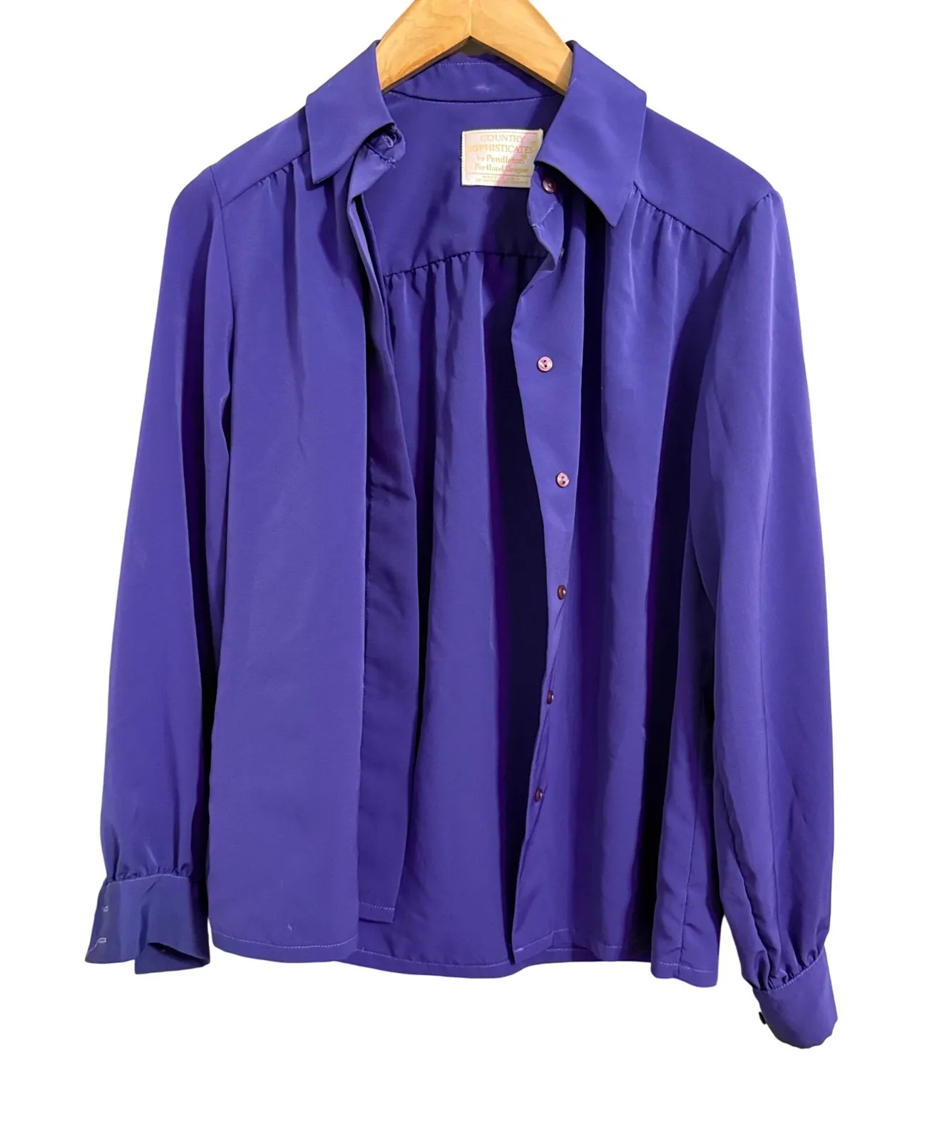 Radiate vibrant confidence in this stunning Country Sophisticates by Pendleton purple blouse. The silky fabric drapes beautifully, creating a flattering silhouette with subtle gathering at the neckline and a chic tie detail. Elegant button cuffs add a polished finish to the long sleeves. Perfect for adding a pop of color to your work wardrobe or for a stylish weekend brunch. Measurements: • Shoulder to Shoulder: 16 in • Bust: 21 in • Waist: 20 in • Sleeve Length: 22 in • Total Length: 25 in Type: Blouse Department: Women Style: Basic Material: Polyester Blend Neckline: Collared Sleeve Length: Long Sleeve Sleeve Type: Classic/Fitted Sleeve Pattern: Solid Accents: Button, Pleated Theme: Classic, Retro Features: Collared Fit: Classic Fabric Type: Rayon Occasion: Casual, Business Closure: Button Keywords: vintage blouse, purple top, Pendleton shirt, retro fashion, button down, workwear, sophisticated, classic style, feminine, elegant, silky blouse, long sleeve