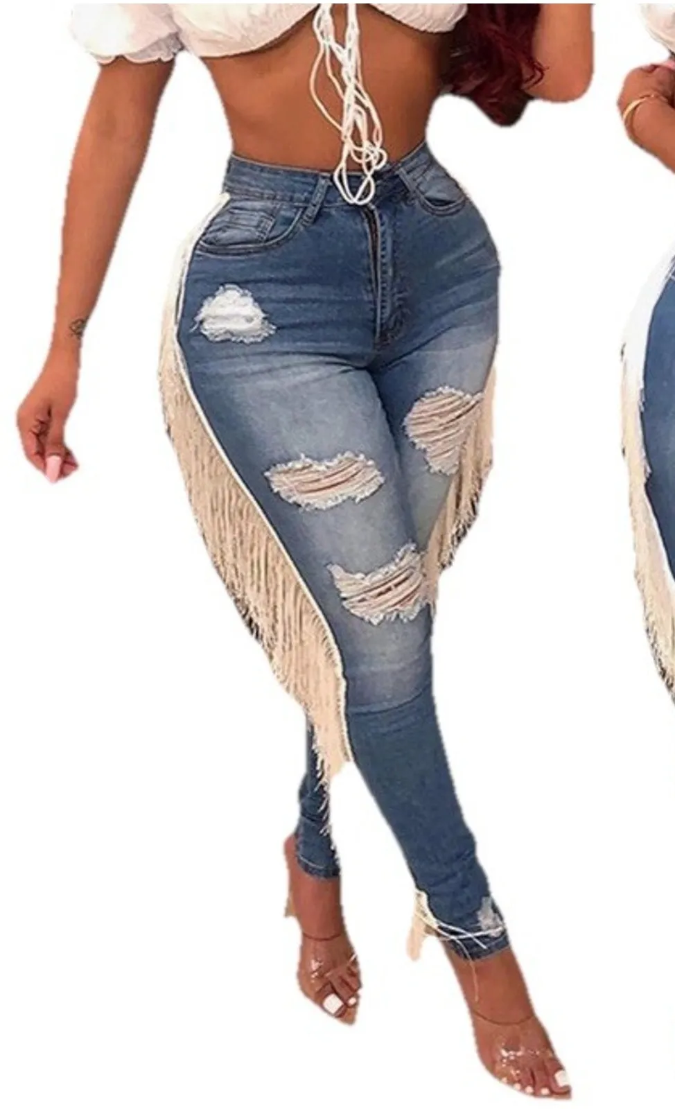 Excellent condition! Stretchy! Lying flat Waist 17” Hips 22” Front crotch to top 10” Back crotch to top 13” Inseam 30” Bottom hem 6” Turn heads instantly in these bold cowgirl-inspired fringe jeans. Designed with a curve-hugging high rise, shredded distressing, and dramatic cascading side tassels, they're the perfect mix of Western flair and street-style attitude. The stretch denim keeps them comfy while the statement fringe adds serious movement with every step. Pair with heels or boots and get ready to steal the spotlight wherever you go. western, rodeo, festivalfit, nightlife, glam, highrise, stretchydenim, showstopper, boldlook, tassels, statementpiece, curveflattering, partyvibes, dramatic, trendyfashion, unique, cowgirlcore, runway, standout, fashionista, chicstyle, nightout, eye-catching, stylish, influencer