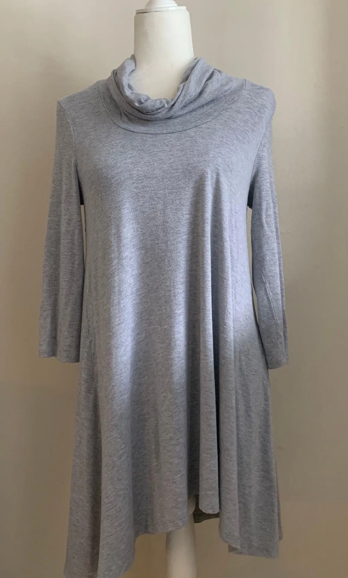 - brand: Grace - cowl neck dress/ tunic - longer in the back than front- perfect with leggings! - soft, stretchy and comfortable - 3/4 length sleeves - size: small - color: light grey - great preowned condition - 95% rayon, 5% spandex - APPROXIMATE MEASUREMENTS- - length: 33” - pit to pit: 18” - waist flat: 18”