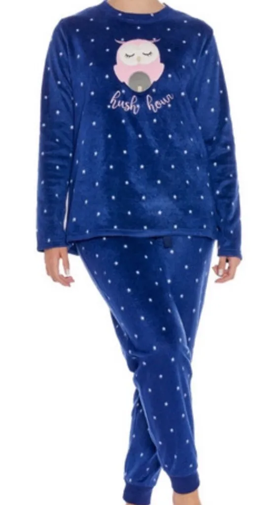 Cozy Critter Blue and White 2-piece Owl Fuzzy Fleece Pajama Set Size Large Top Bust 20” Length: 25” Pants Waist 17” Length 28” Condition: Excellent • No Flaws These are a dark blue, long-sleeved pajama set made of a plush material. The pajamas are decorated with a pattern of small white stars. The top features a sleeping owl appliqué on the chest with the embroidered text "hush hour" below it owl print, plush fleece, star pattern, dark blue, cozy sleepwear, embroidered detail, pajama set, loungewear, animal motif, fuzzy fabric
