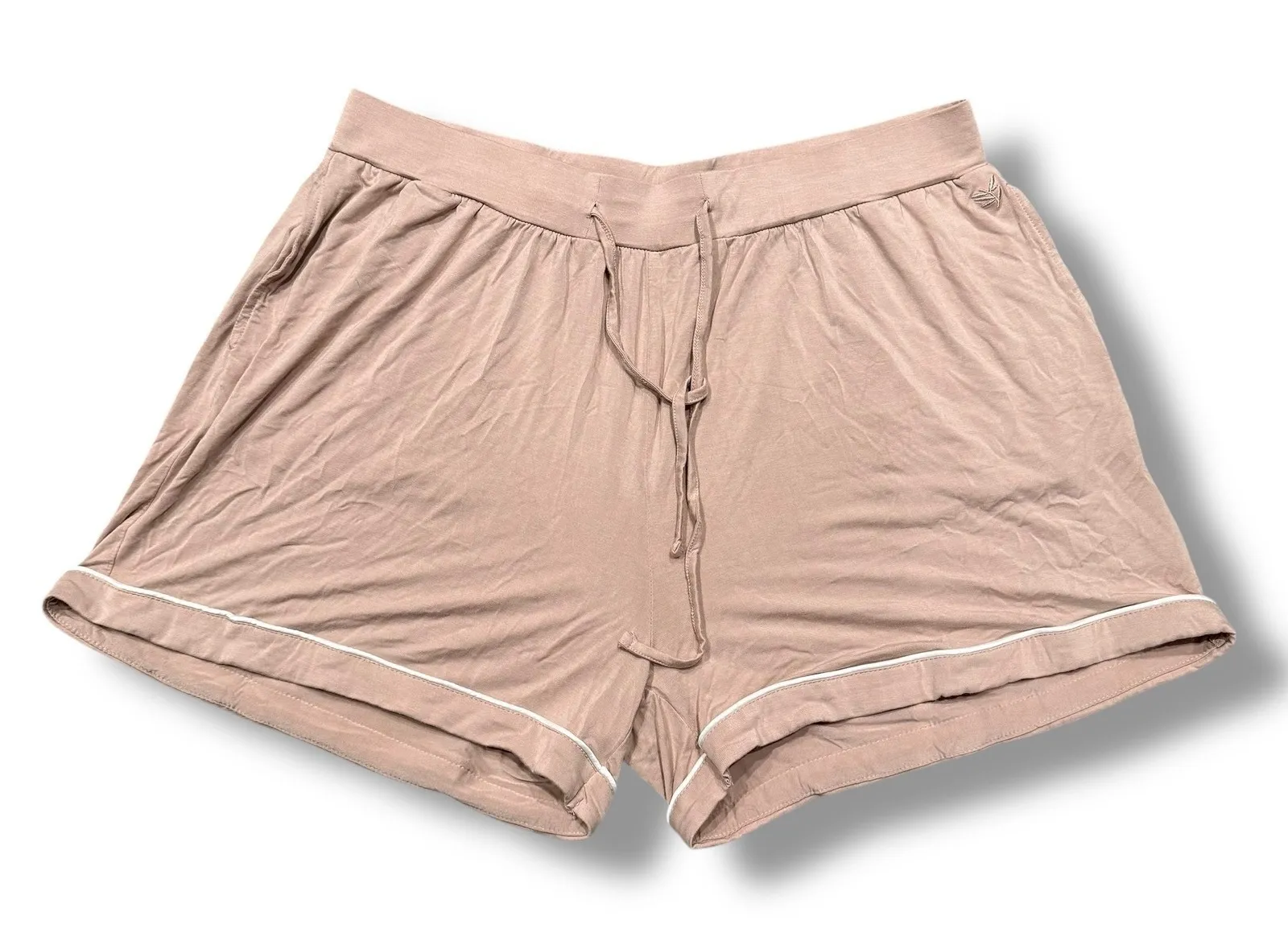 Indulge in ultimate comfort with these luxuriously soft lounge shorts. Experience the blissful feel of premium bamboo fabric against your skin, offering unparalleled breathability and a silky smooth touch that promises a serene sleep experience. The elastic waistband with a drawstring ensures a perfect, adjustable fit, while the classic piping detail adds a touch of refined elegance. Side pockets offer convenient functionality for your essentials. Perfect for cozy nights in, lazy weekend mornings, or relaxing spa days. Measurements: • Waist: 36 in • Inseam: 3 in • Rise: 12 in • Leg Opening: 13 in Type: Sleep Shorts Department: Women Pattern: Solid Material: Bamboo Fabric Type: Knit Closure: Drawstring Season: Summer Accents: Logo Garment Care: Machine Washable Unit Type: Unit Keywords: pajama shorts, lounge shorts, sleepwear, loungewear, bamboo, cozy, soft, comfortable, plus size, XXL, tan, neutral, athleisure