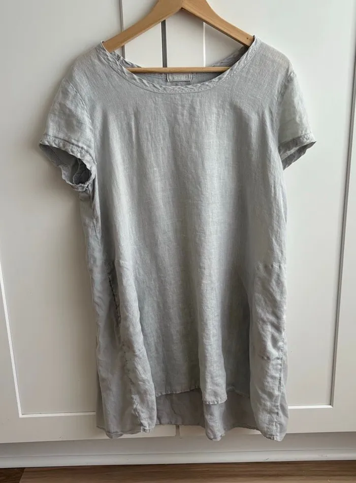 Effortless CP Shades tunic dress in a soft gray tone with a relaxed lagenlook silhouette. Made from breathable linen with mixed media detailing for subtle texture and interest. Features short sleeves and an easy, flowy fit that works perfectly layered or worn on its own. ✨ Comfortable, artsy, minimalist vibe 🌿 Lightweight linen — perfect for warm weather 👗 Tunic length, relaxed fit 🖤 Versatile gray neutral for everyday wear Size: Women’s Large Condition: Great pre-owned condition 0305