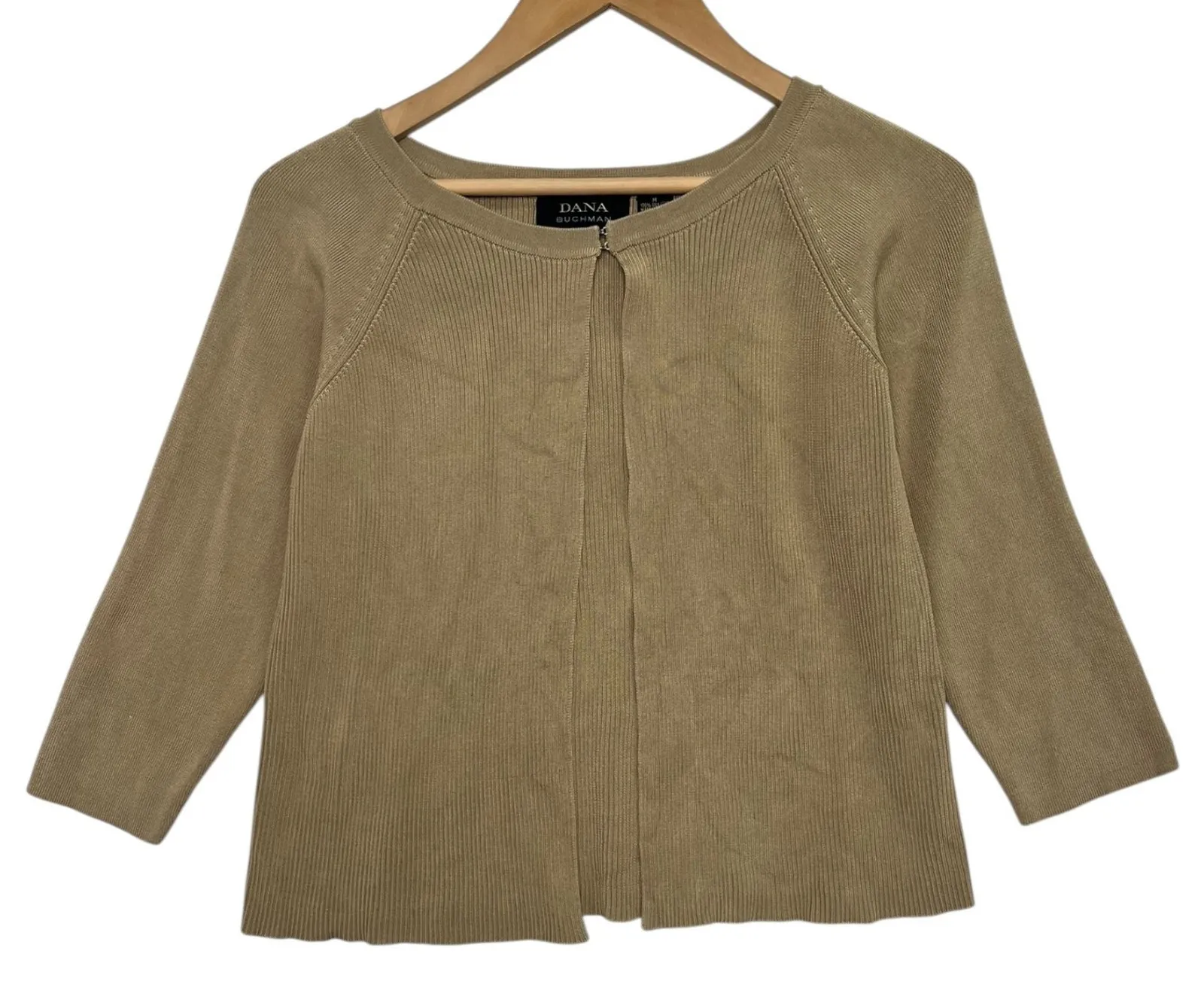 Silk, Classic, Minimalist, Chic Brand: Dana Buchman Type: Cardigan Department: Women Size: Medium Color: Tan Material: 100% Silk Style: Lightweight Knit Open Front Cardigan Sleeve Length: 3/4 Sleeve Closure: Hook and Eye Condition: Pre-owned, small flaw noted (see photo with blue sticker) Made in: China Care: Dry Clean Only Style Number: DBM01133 SKU: 3165 Bust - 17 inches Length - 20 inches Good pre-owned condition - small spot as noted - see pics and ask questions for more details. minimalist classic elegant neutral capsule wardrobe timeless chic officewear luxe naturalfiber
