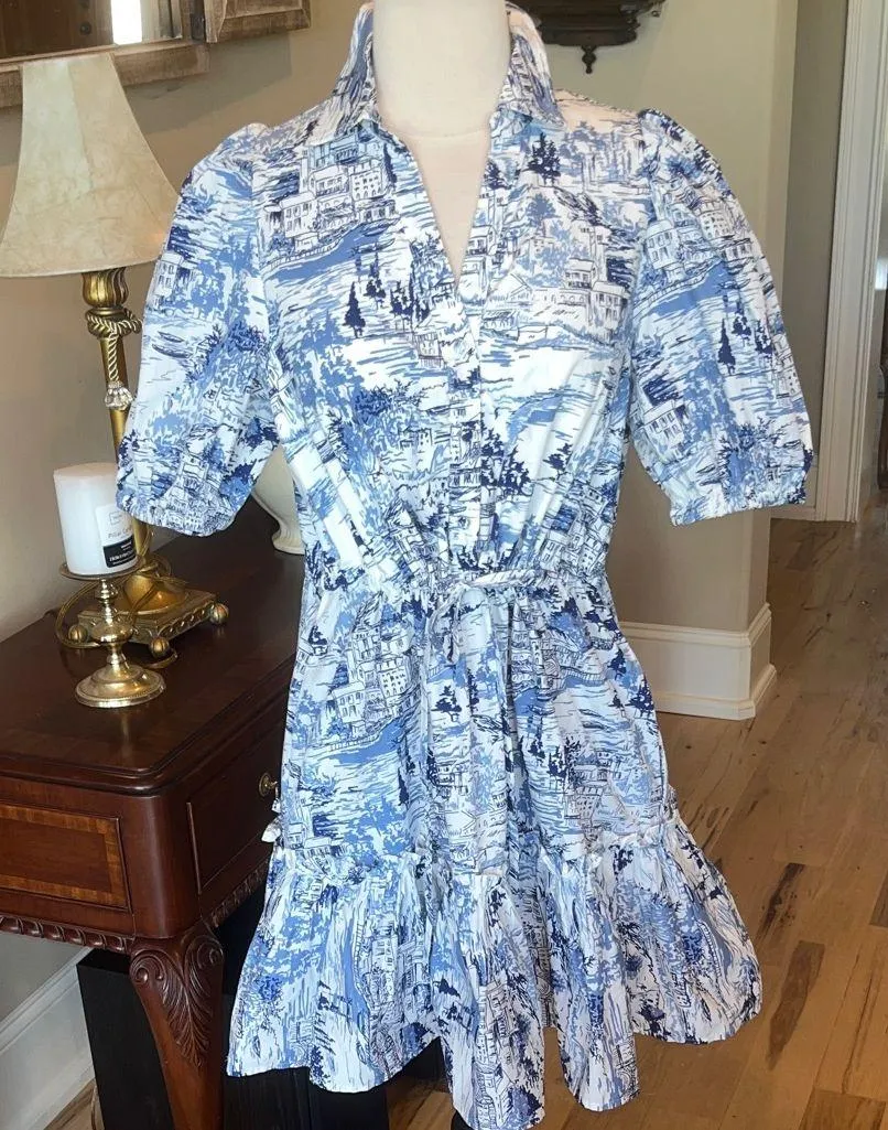 Cinched drawstring waist Puff sleeve Ruffle hem Collegiate Party Office Fabric button down