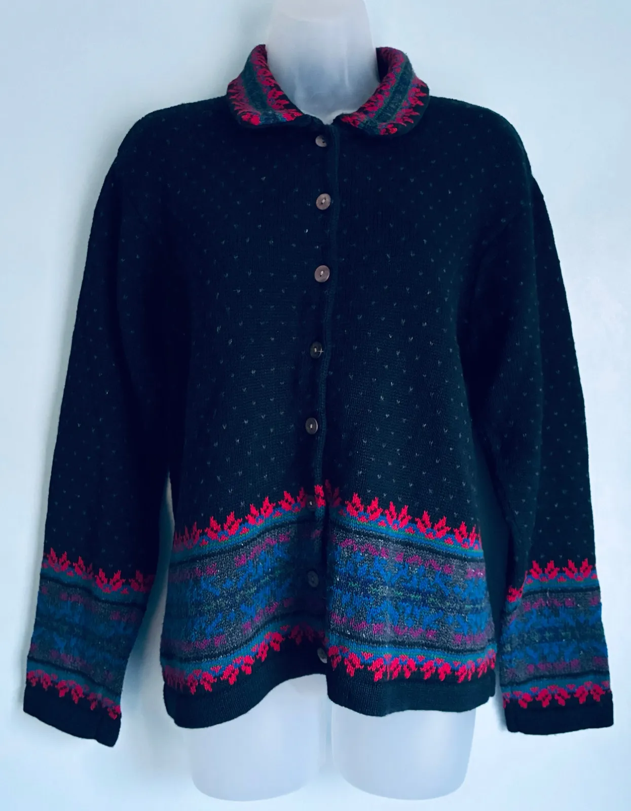 Crazy Horse Liz Claiborne Large Petite Grannycore Button Up Collared Cardigan Cottage Size: Large Petite Color: Black with blue, red, pink and gray design Measures: 23" pit to pit and 25" long In excellent preowned condition. Material: 55% Ramie, 45% cotton Smoke free home. See pictures for condition. Bundle and save! Questions welcome!