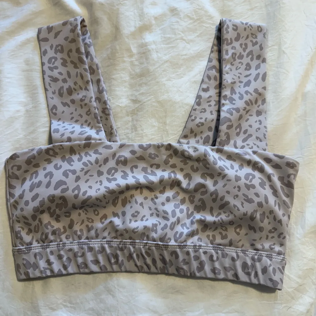 This sports bra features a striking animal print in cream and brown, offering a stylish and supportive fit with its wide shoulder straps. The bandeau-style front and cropped length make it perfect for both athletic activities and lounging. Crafted from a stretchy material, it ensures comfort and flexibility throughout the day.