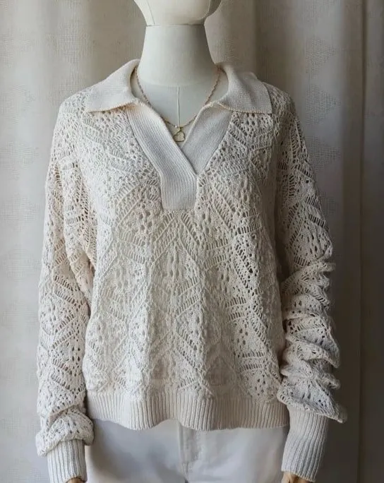 New with tags Cream crochet knit collared pointelle sweater in excellent condition. Size M BIN 5 #crochet #knit #boho #bohemian #coquette indie cottagecore minimalistic lace minimal casual summer beachy beach vacation summer spring neutral