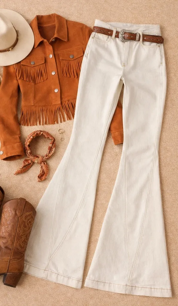 Boho-chic ban.jara flare jeans in a soft cream / off-white stretch denim. Features a flattering mid-rise fit with dramatic panel-seamed bell bottom legs that create a vintage-inspired silhouette. Perfect for boho, festival, western or Y2K styling. Soft cotton blend with stretch for comfort. Classic 5-pocket design with zip fly and button closure. Easy to dress up with platforms or style casually with sandals. First two photos are for styling inspiration only. Details: • Brand: ban.jara • Size: 1 / 24 (fits approx XS / 0–2) • Color: Cream / Ecru • Fabric: 98% Cotton, 2% Spandex • Made in Bangladesh Measurements (flat): • Waist: 13.5” • Rise: 10” • Inseam: 31” Excellent preowned condition. Please compare measurements for best fit.
