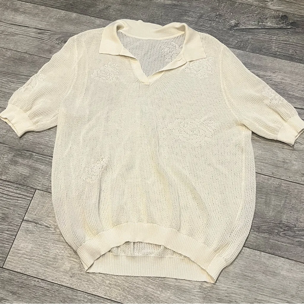 Cream Knit Short Sleeve Collared Sweater See Through Flowers Floral Womens 3X - $14 - From Krys