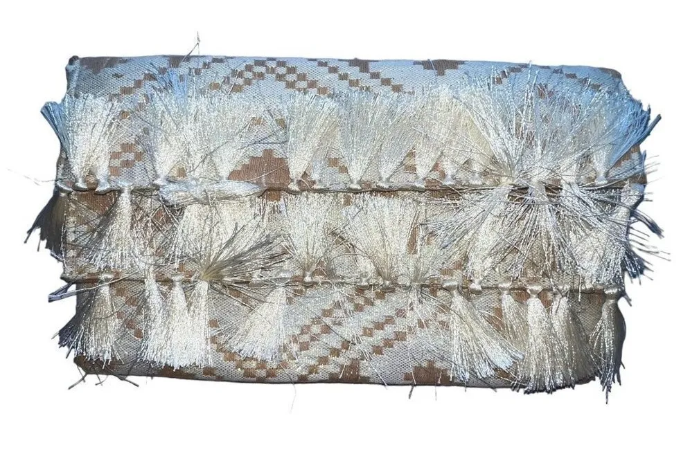 This cream and tan clutch purse is perfect for any occasion, whether it's for travel, a party, or just a casual day out. Its rectangular shape and snap closure make it easy to carry around and access your belongings. The exterior is made of a woven canvas material with Aztec accents and a stylish tassel. The interior is lined with a beige color and features a folding design. This clutch purse is a must-have for any bohemian or Indian themed outfit. Women ladies junior teenager see pictures for measurements gently used with no flaws Offers welcome.Bundle and save! Smoke free pet free home. Ships out next business day Thank you for checking out my closet 35