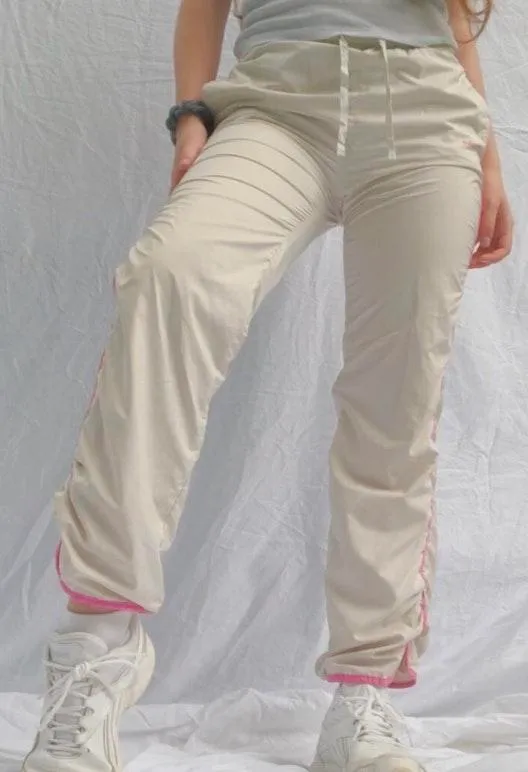 Super dope y2k track pants with pink lining at the sides. Scrunched at the bottom so it’s super flattering and cream colored - Best fits an xs to small or 16 kids - ALWAYS OPEN TO OFFERS Cream colored track pants, nylon pants