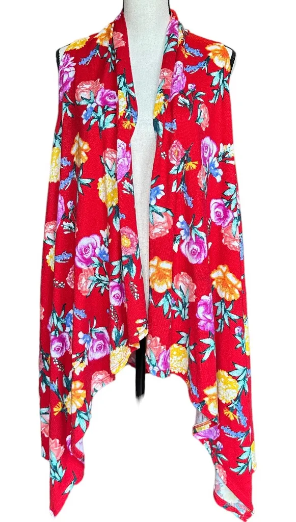 Red Floral Sleeveless Cardigan Sz 3XL Stretch Wearable All Seasons Breathable Lightweight 97% Polyester/3% Spandex Approximate measurements: Underarm to Underarm: 24" (flat lay); Shoulder to hem: 29" No holes or stains