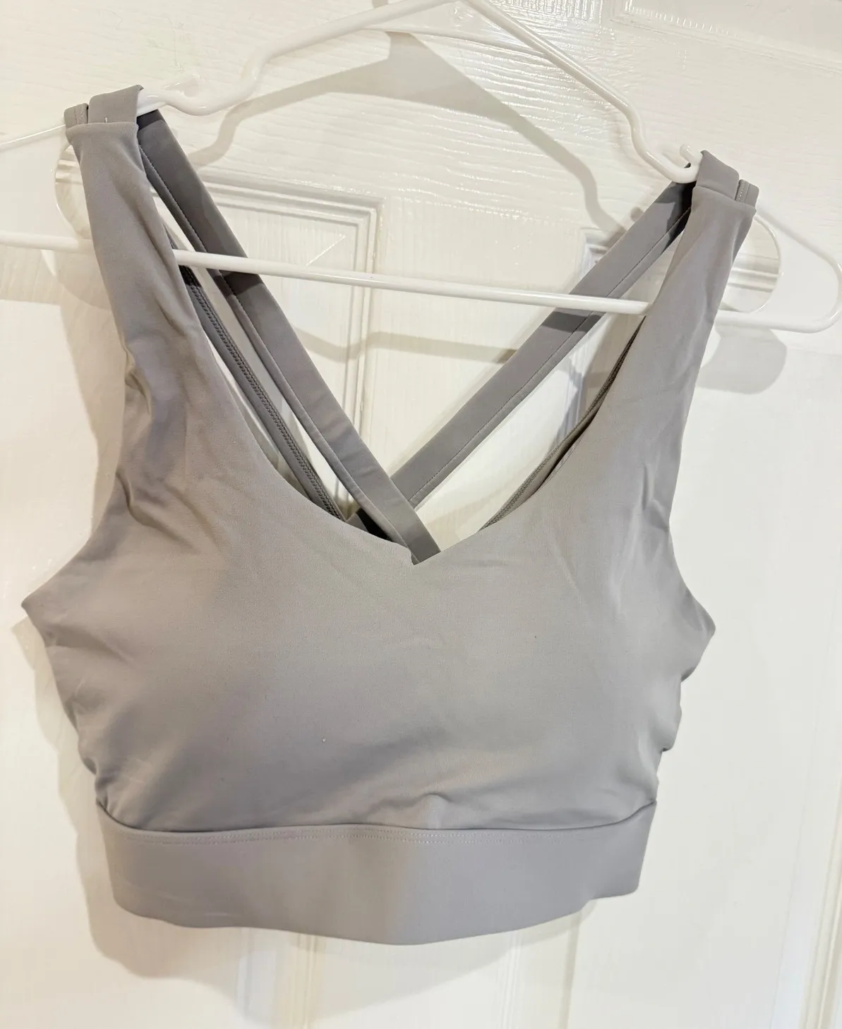 Stylish and supportive sports bra designed for medium-impact activities. This bra features a flattering V-neckline and a unique criss-cross back design that not only looks great but also provides enhanced support and freedom of movement. The wide underband ensures a secure and comfortable fit, while the removable pads offer customizable shaping and support. Perfect for yoga, Pilates, gym workouts, or as a comfortable everyday bra. Color: Gray Type: Bra Style: Sports Bra Support Level: Medium Character: Belle, Harmony, Jill, Sofia, Jane Features: Padded, Stretch, Removable Pads, Moisture Wicking, Lightweight Performance/Activity: Yoga, Pilates, Gym & Training, Running & Jogging, Athleisure Department: Women Ask for measurements!
