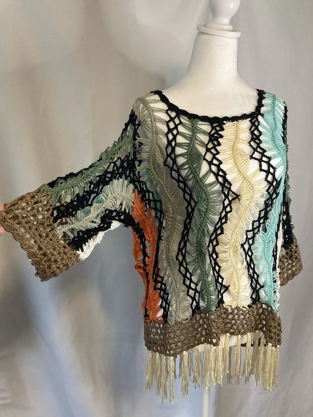Shoulder 15 Pit to pit 23 Arm 16 Length w/Fringe 27 Pre-Owned good condition. Ships same to next business day from smoke free home. #boho #bohemian #lagenlook #layering #colorful G18