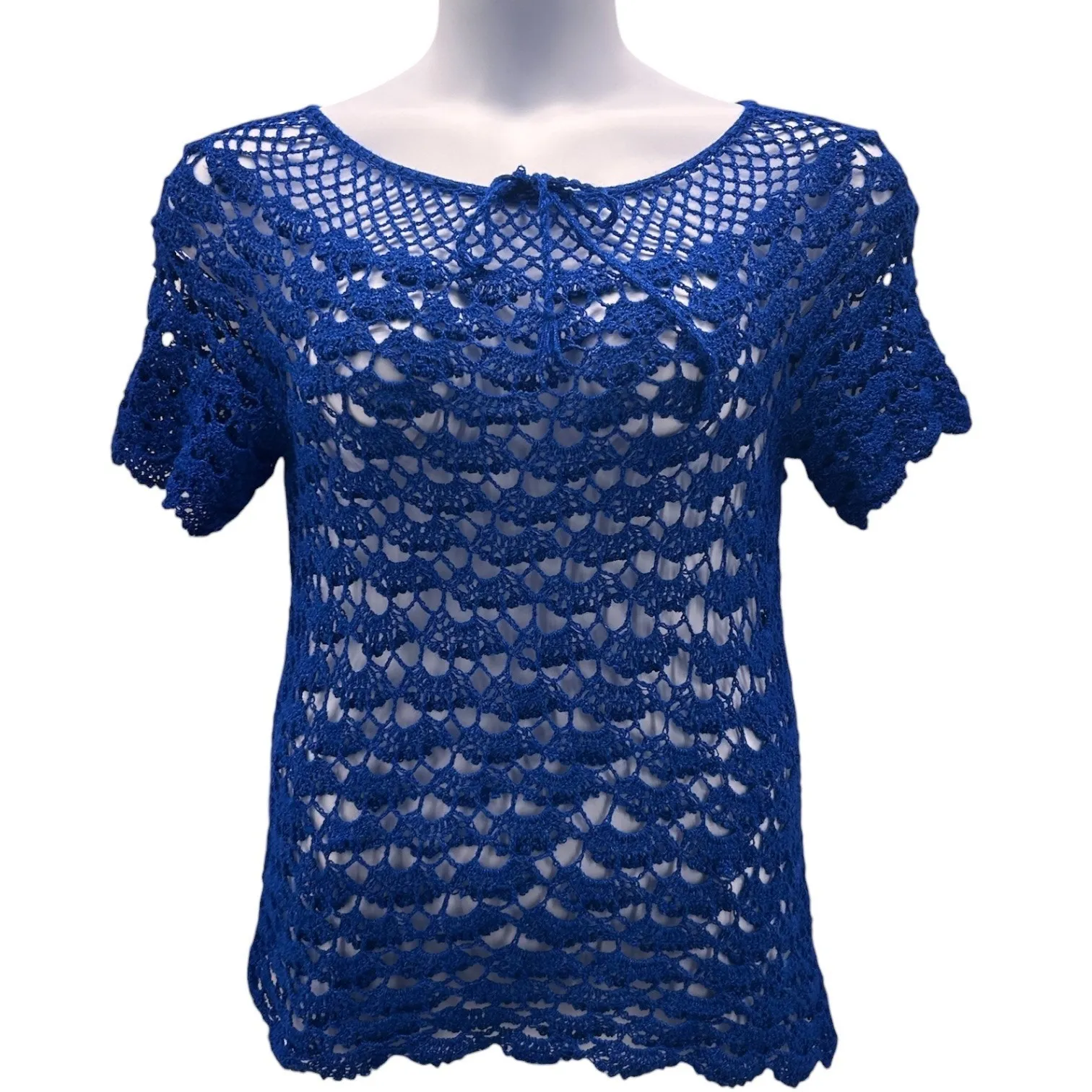 Capture attention with this vibrant royal blue crochet top. The intricate open knit design creates a beautiful, airy texture, perfect for adding a touch of artisanal charm to your wardrobe. A delicate tie at the neckline offers a hint of detail and a customizable fit. Short sleeves provide a comfortable and versatile silhouette. This piece is designed to be a standout addition to any fashion-forward collection. Measurements: • Pit to Pit: 16 in • Length: 25.5 in Thank you for checking my item. If you have any questions before and after purchase, please contact me first. Items came from smoke free, dog friendly home. I use a fabric softener that has fresh scent smell. Please check measurement before buying. My handling time is 1 business day. Have a great day!!!!!