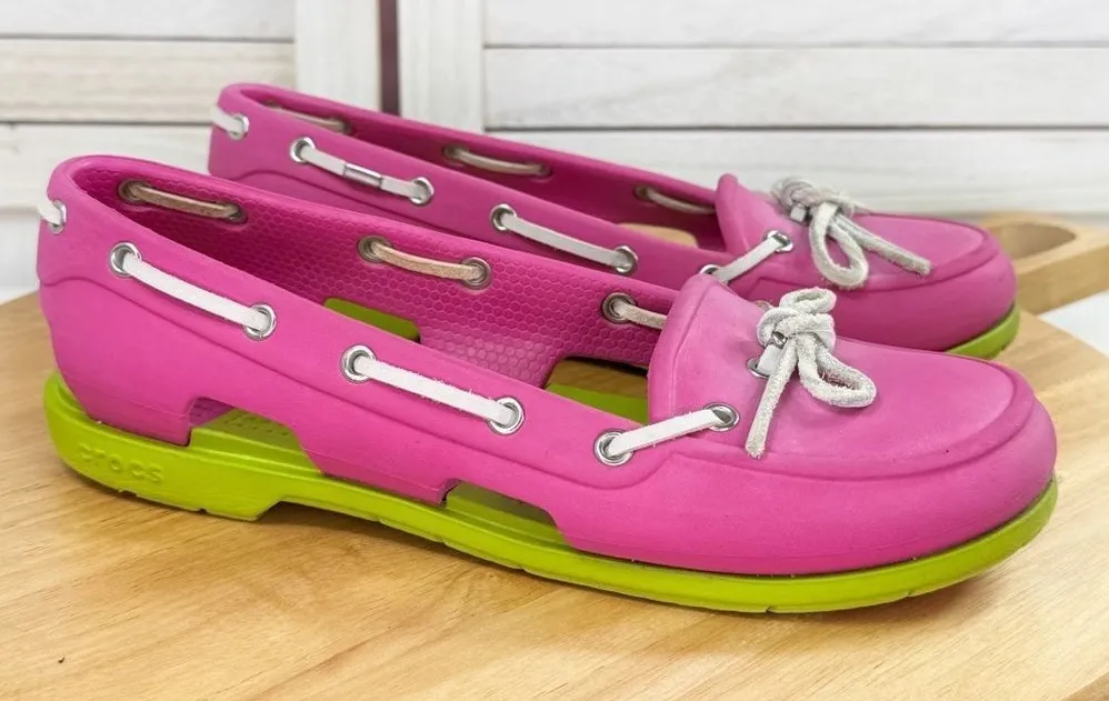Crocs Beach Line Slip On Boat Shoes Pink Green Women Size 7 Dark pink upper Lime green sole Sid... Show more