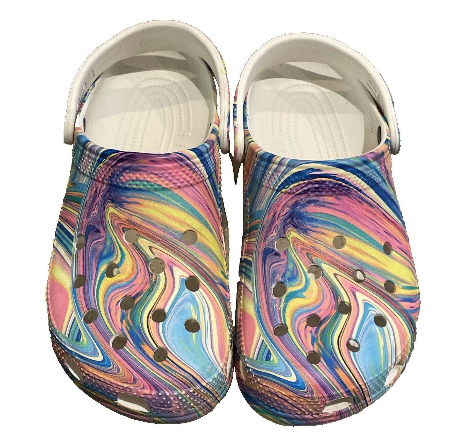 Multicolor pink, yellow and blue, Out of this World swirls on a white Classic Clog shoe by Crocs in... Show more