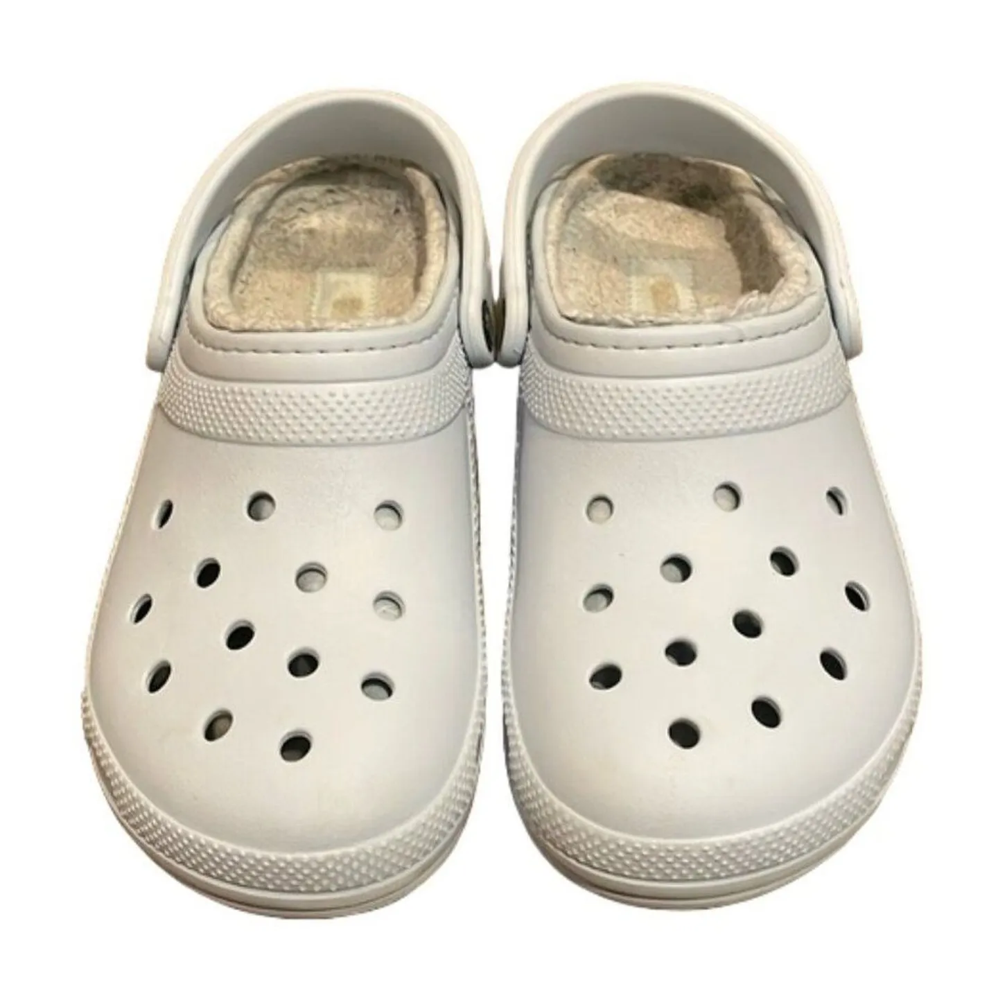 Pale blue, Classic Lined Clog sandal, shoes by CROCS in unisex size men's 7 and women's 9. Style # 20359. Soles are uppers are in great shape. Insoles shoe uses. The liner is not removable. Shoes have been washed and deodorized. In very good pre-owned condition with some signs of wear from normal use. casual, winter, comfort, faux fur, slip-on, fall, spring, slipon, loungewear