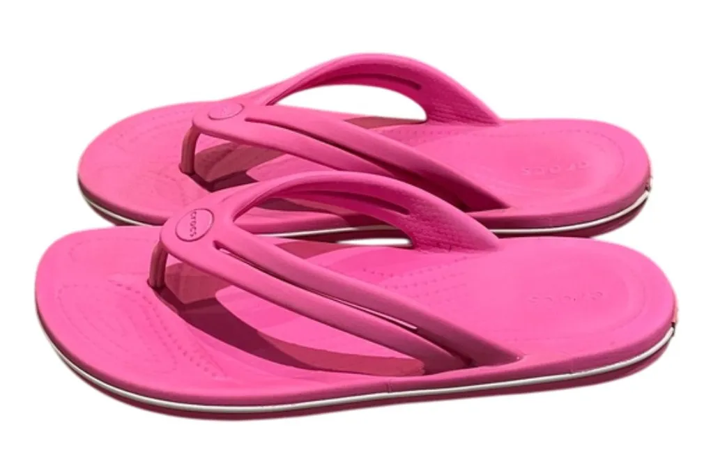 Pink, slip-on, crocband, flip flop, thong sandal, shoes by CROCS in a women's size 7. White accent o... Show more