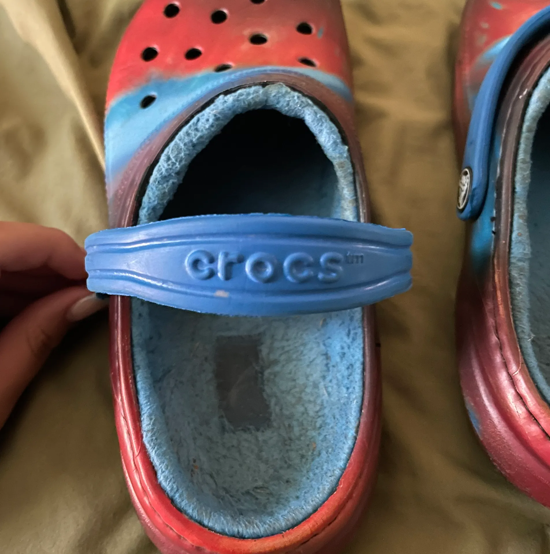Red and blue crocs with fluff on the inside, size 4 adult, inside is a little worn but the outside l... Show more