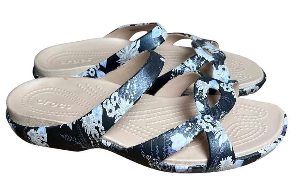 CROCS Meleen Twist Graphic Sandal black with white/gray/lavender floral print Women’s size 9 Very... Show more