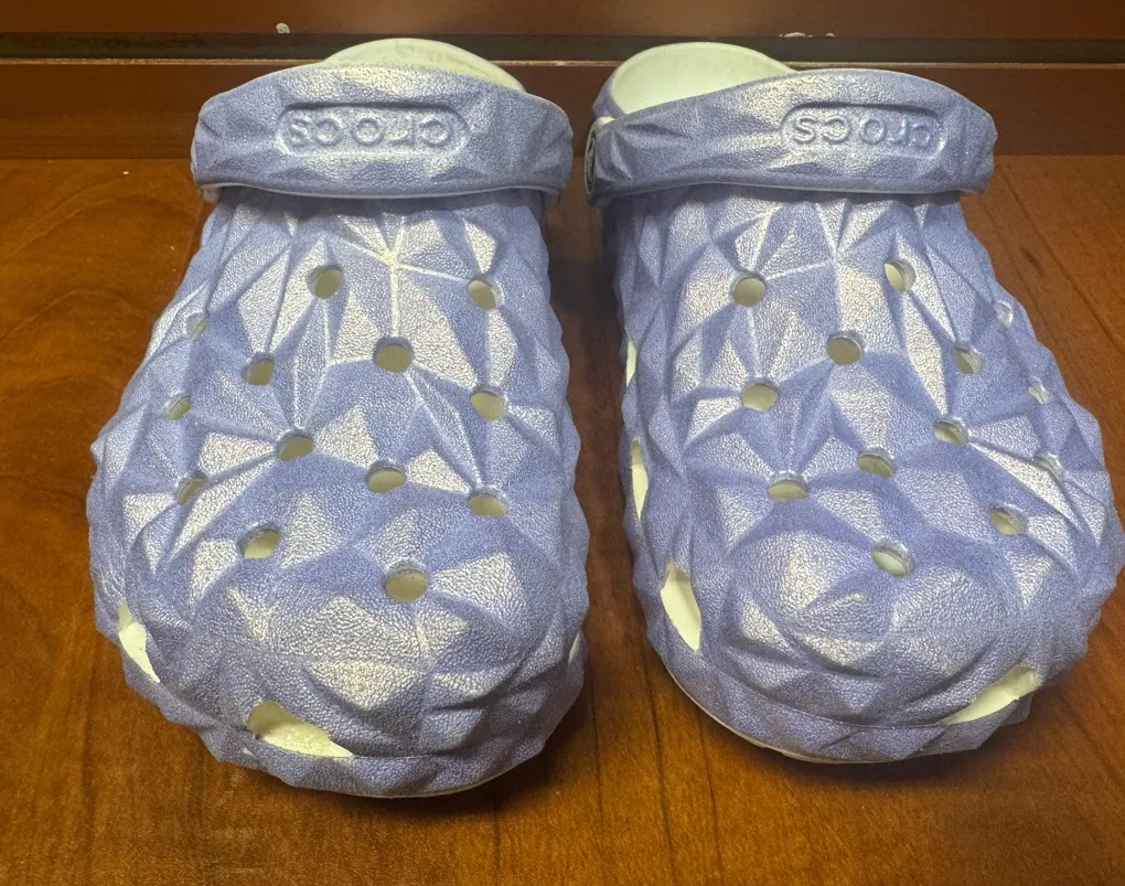 Stylish purple slippers by CROCS. Comfortable and lightweight. Perfect for casual wear.