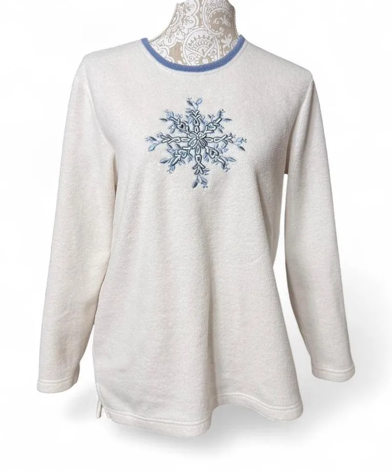 ✨ Cozy embroidered winter top by Croft & Barrow, women's size Medium. Features a soft white fleece-l... Show more