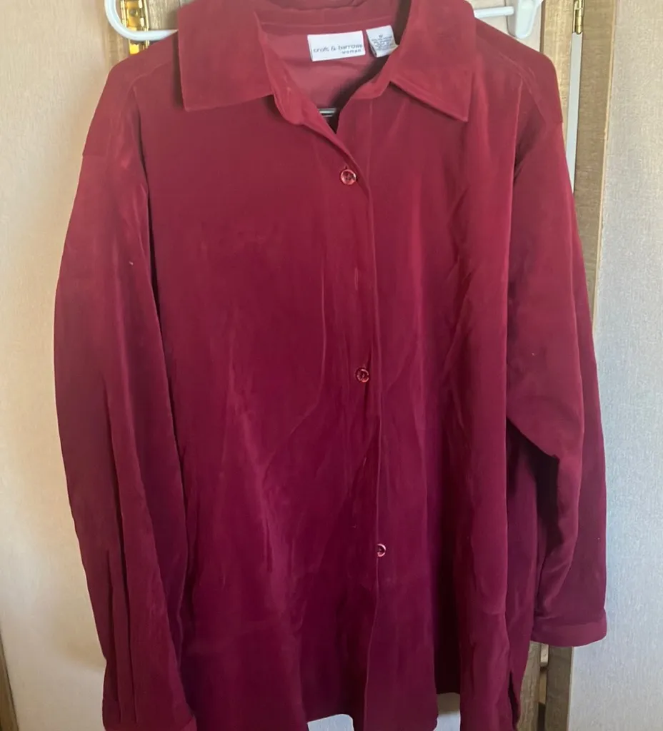 Elegant burgundy shirt with button-up front. Features a classic collar. Ideal for versatile styling.... Show more