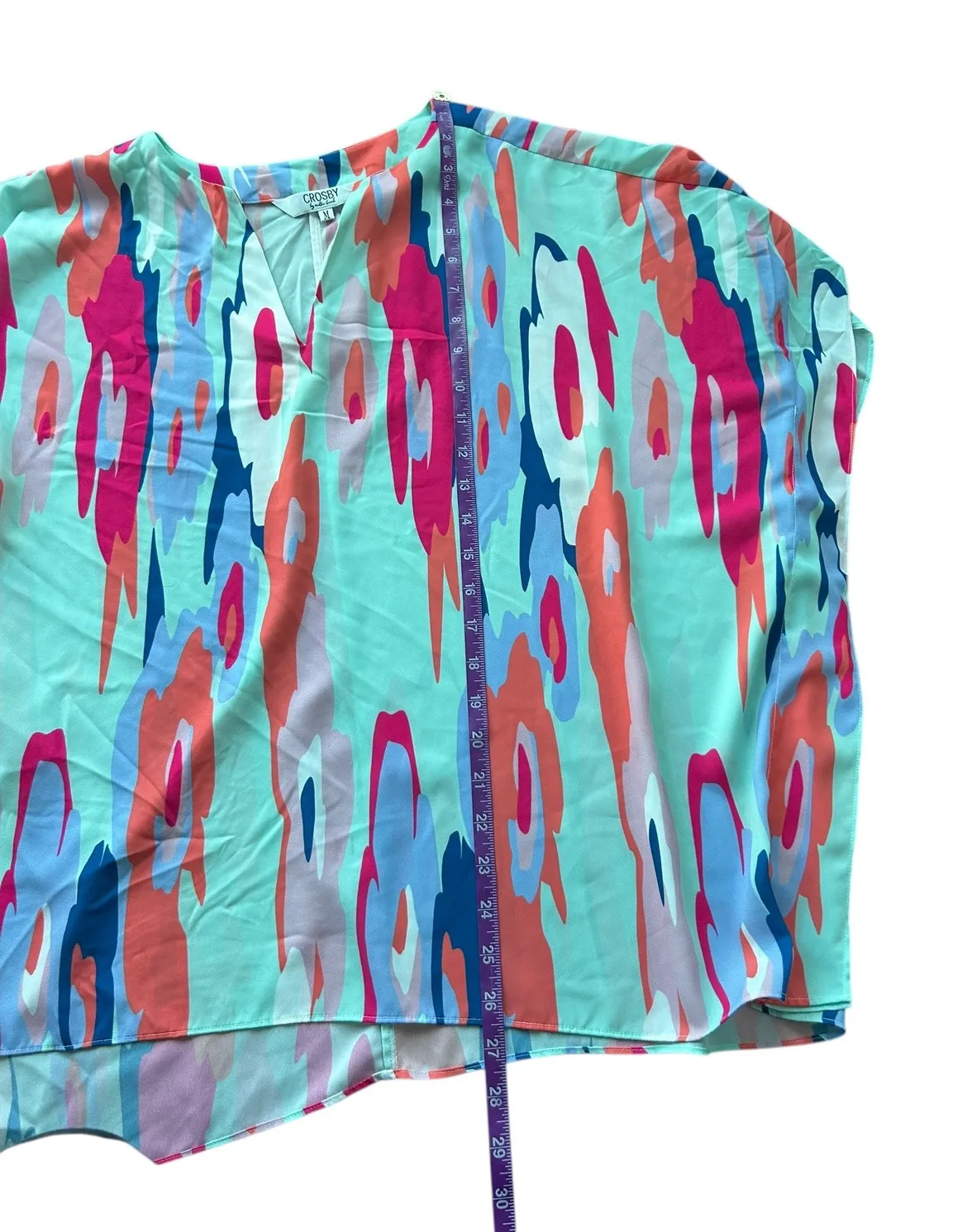 Brighten your wardrobe with this vibrant CROSBY by Mollie Burch tunic top, a wearable piece of art designed to make you feel cheerful and chic. The captivating abstract print, a dynamic blend of aqua, coral, pink, and blue, creates an energetic and eye-catching look that transitions effortlessly from day to night. Its relaxed fit and flattering V-neckline offer both comfort and style, while the short sleeves provide a breezy feel perfect for warmer weather. This versatile top is ideal for casual outings, weekend brunches, or a stylish addition to your vacation attire. Measurements: • Chest (pit to pit): 27 in • Length (shoulder to hem): 27 in Type: Blouse Department: Women Style: Tunic Material: Polyester Neckline: V-Neck Sleeve Length: Short Sleeve Sleeve Type: Casual Sleeve Pattern: Geometric Fit: Relaxed Keywords: abstract print top, color block, v neck tunic, short sleeve blouse, women's fashion, casual wear, resort wear, bold print, breathable fabric, summer style, statement piece Ships fast from pet & smoke free home. offers welcome! Please review all photos.