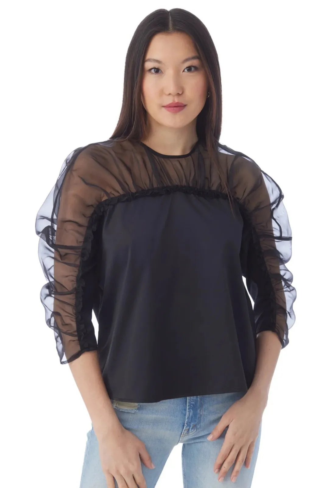 The Faye Top is an elevated take on a classic silhouette. She features a dropped shoulder with fabric contrast in the Black and Undone colorways. We love her relaxed fit and ruffle details along the front yoke and sleeves. Shown in Black Organza (upper)- Sheer textured fabric with a light texture and lustrous sheen Poly Satin Taffeta (body) - A light to medium weight crisp fabric with a lustrous shine. Care - Machine wash cold on delicate cycle or hand wash. Do not wash with hot or warm water. Remove promptly. Lay flat or hang to dry. Cool iron or steam to remove wrinkles as needed. Relaxed fitting, hip-length top Length (taken from a size small) - 24" Joann is 5'8" and wears a small