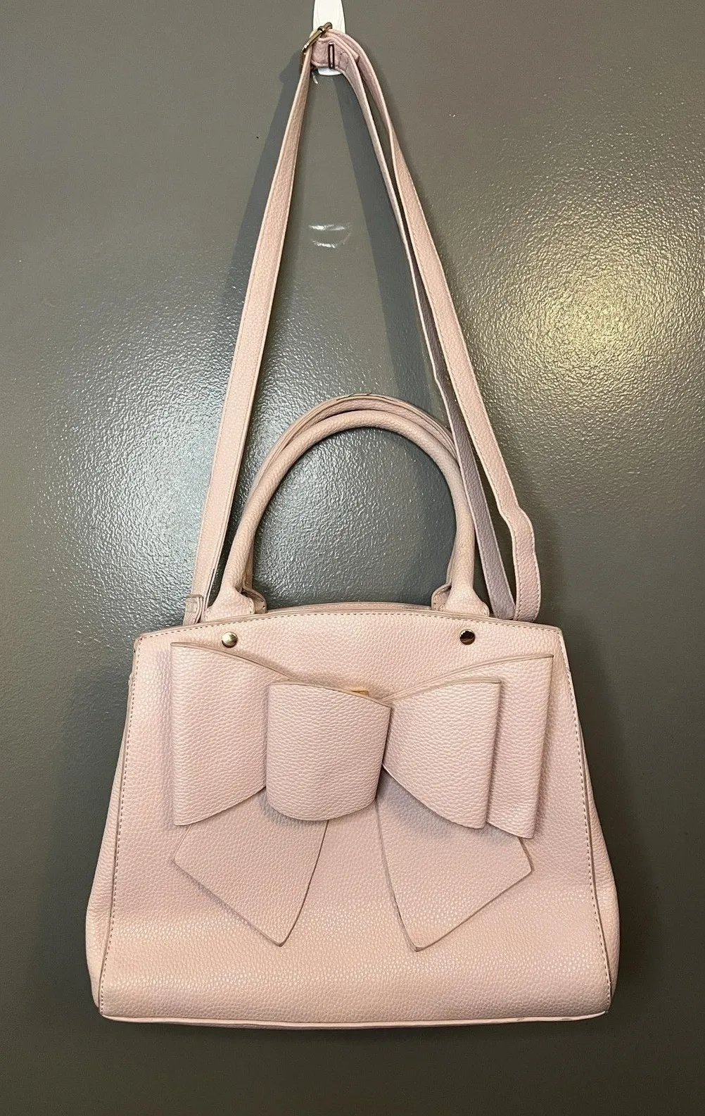 Lightly used with some edge wear and small cracks on the top handle trim. Interior lining has a few faint marks from normal use. Exterior body and bow look clean, hardware and zippers function properly. Brand: Crossi Style: Structured satchel bag with oversized bow detail on the front, dual rolled top handles, and a long adjustable shoulder or crossbody strap. Color: Light pink blush with gold-tone hardware. Materials: Shell 100% polyvinyl chloride faux leather; lining 100% polyester; made in China (per interior tag). Details: Zip-top main closure, multiple interior compartments with a center zip divider, interior zip pocket and slip pockets for organization, pebbled texture exterior, small Crossi logo plaque on the back, and matching embossed Crossi logo patch inside. bin 76 2071