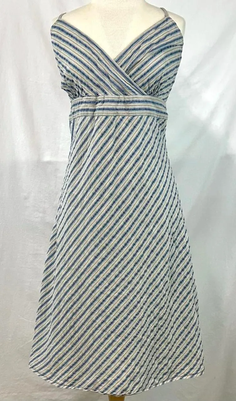 crossing pointe vintage 90s blue and cream striped sleeveless v neck babydoll A line midi dress, plu... Show more