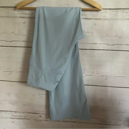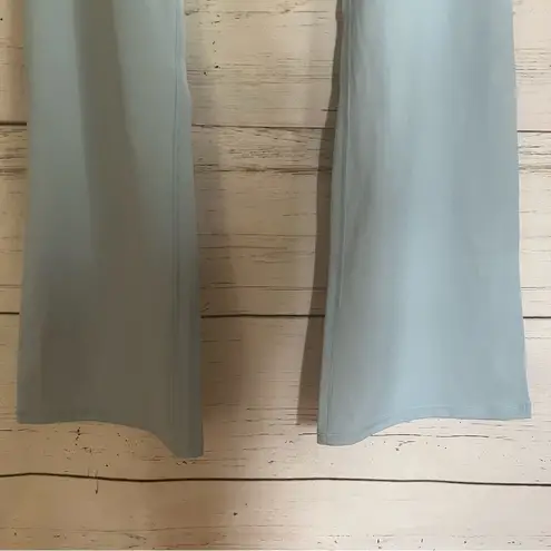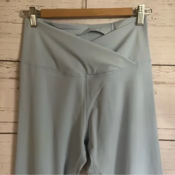 Baby blue leggings with wide crossover waistband, flare leg, hidden pocket in back of waistband, not... Show more