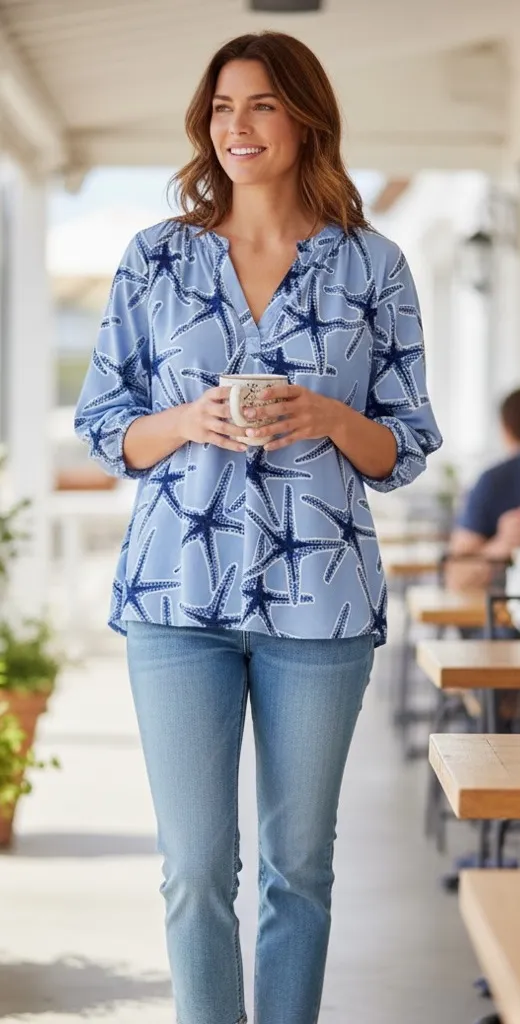 Charming top with starfish design. 3/4 sleeves- 100% rayon- excellent preowned condition- no flaws