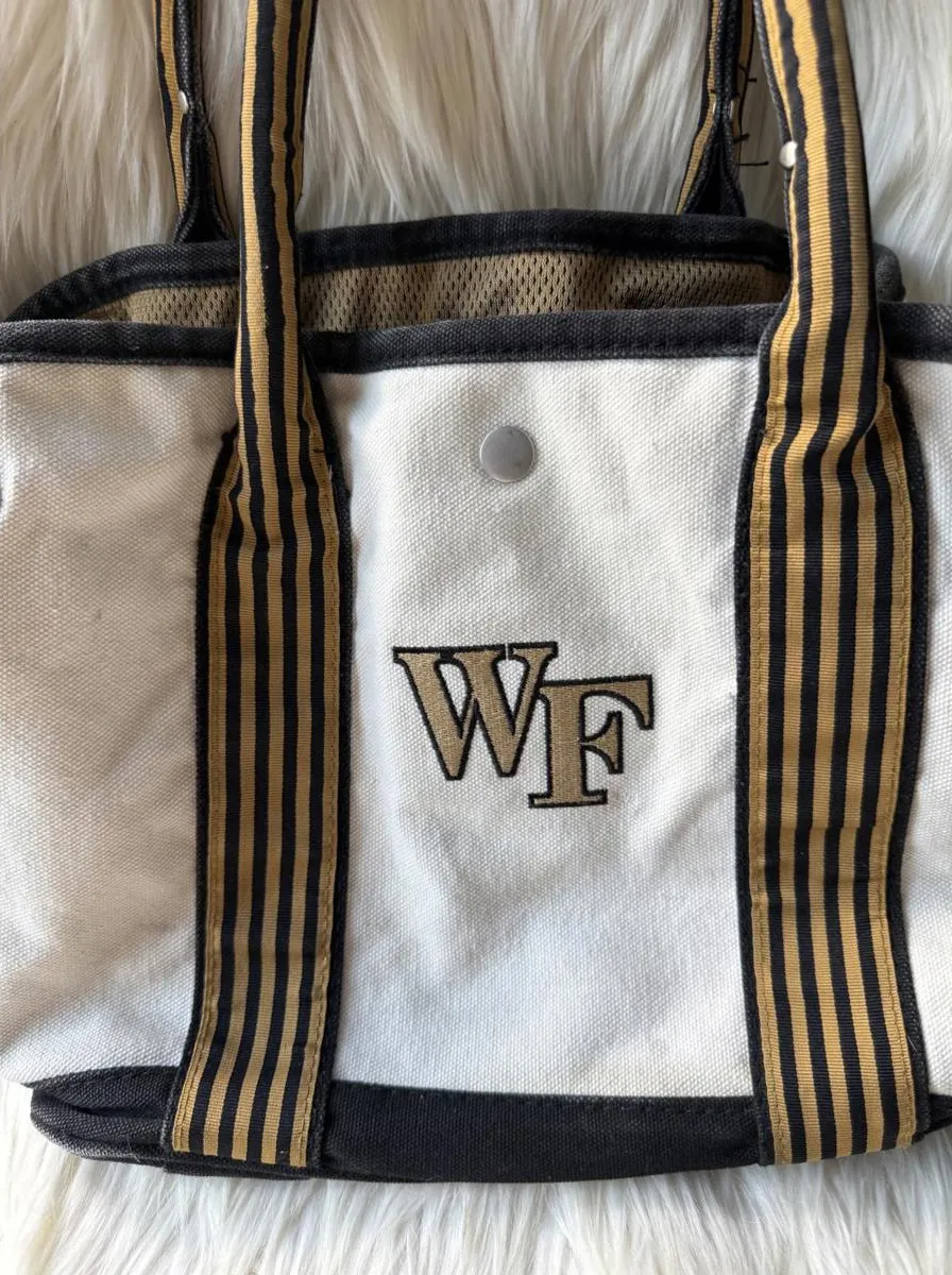 Canvas tote bag with WF embroidered logo on the front. Features striped handles and trim in black an... Show more