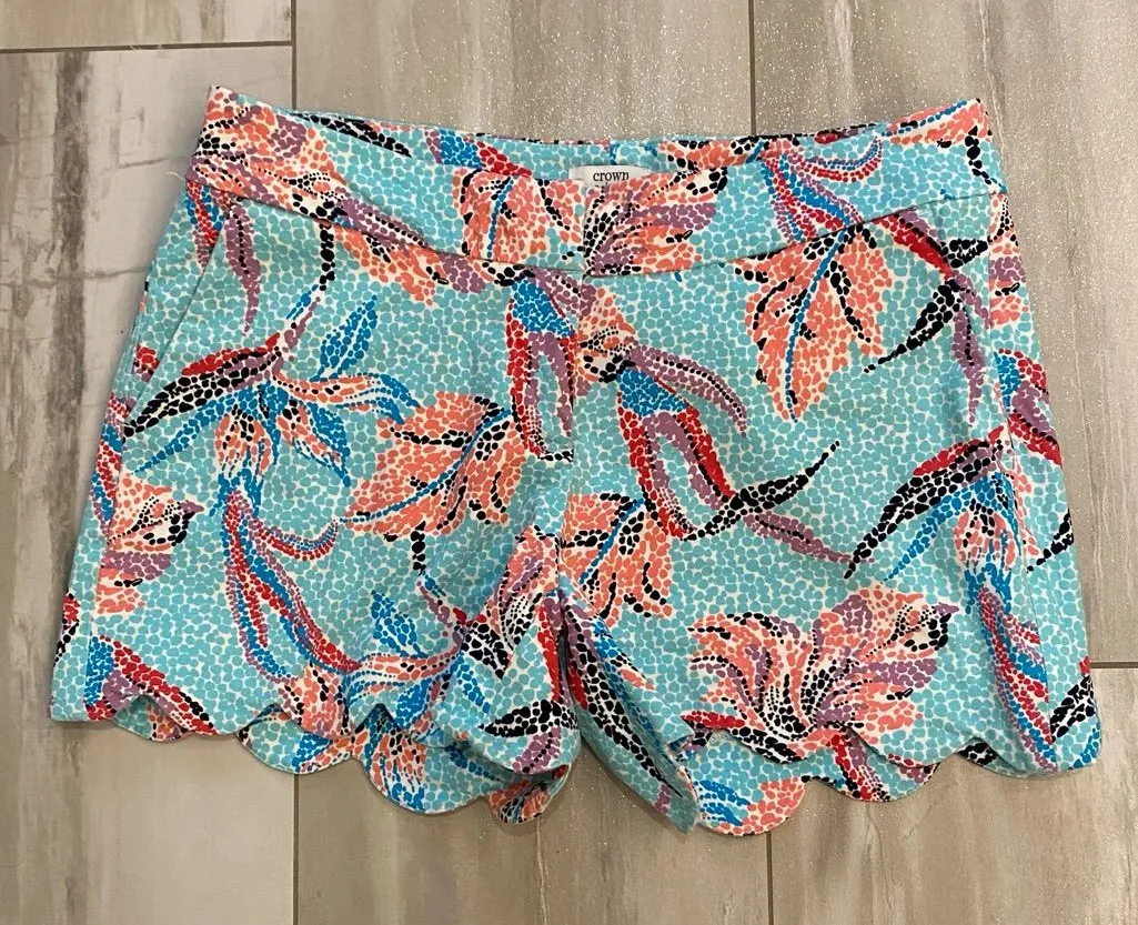 Crown & Ivy mosaic shorts, size 2, scalloped bottom, colorful mosaic pattern, button, tab and zipper... Show more