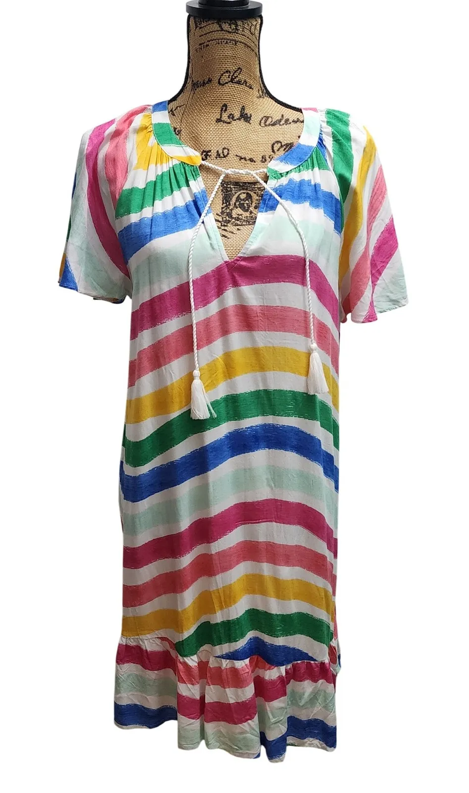 Keywords: Crown & Ivy, rainbow dress, striped dress, peasant dress, midi dress, tie neck, short sleeve, summer dress, vacation dress, casual dress, boho dress, women's dress, size L, new with tags