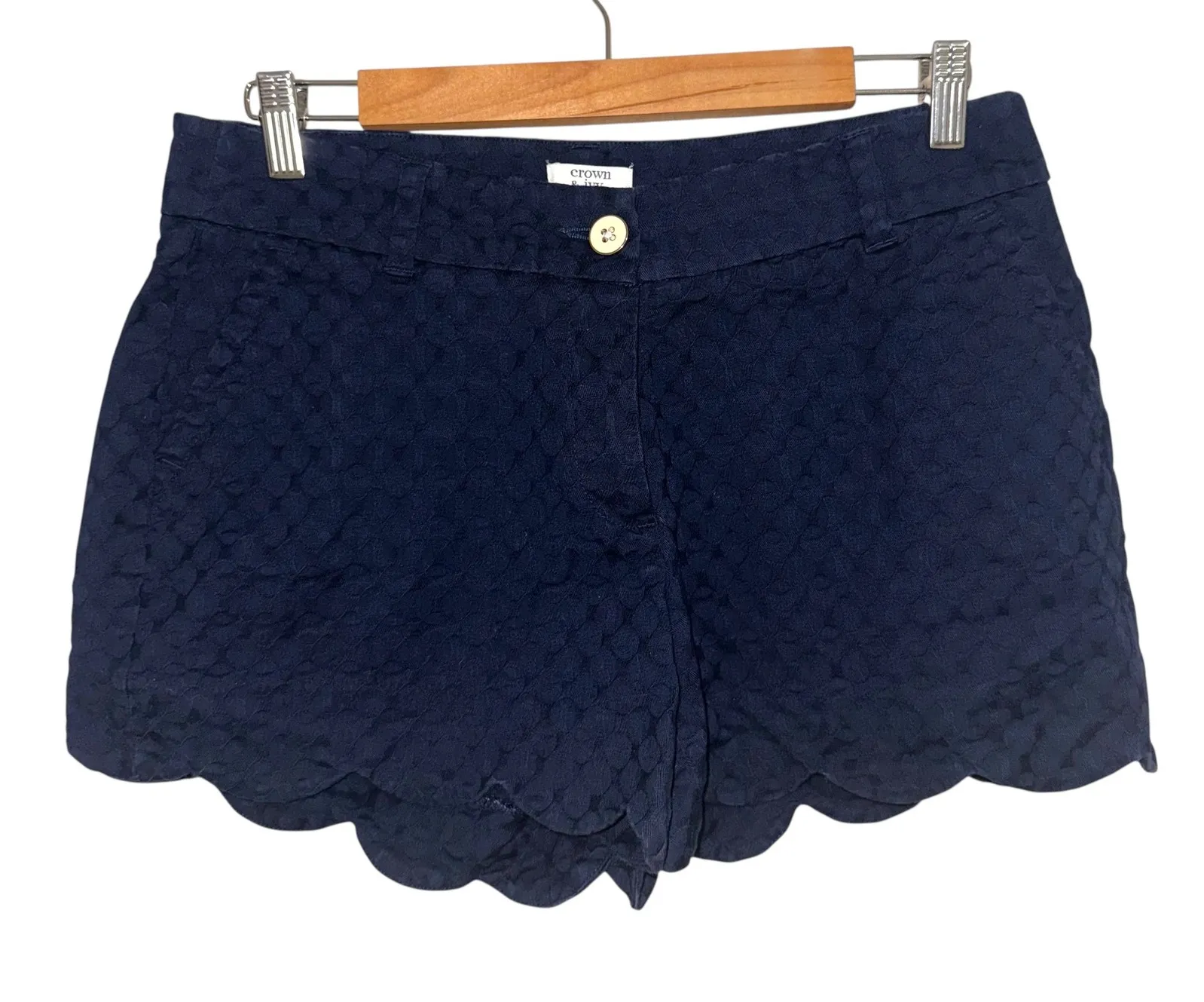 Coastal charm meets everyday comfort in these delightful navy blue shorts. Envision yourself strolling along the boardwalk, the gentle sea breeze playing around the scalloped hem of these stylish bottoms. A subtle, textured pattern adds a touch of understated elegance, while the thoughtful design ensures a flattering fit. The gold button provides a refined detail, complemented by a charming accent on the back pocket. These shorts offer a blend of sophistication and ease, perfect for a casual brunch with friends, a relaxed afternoon exploring a new town, or a weekend getaway by the ocean.