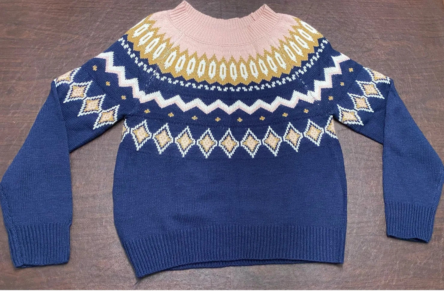 Crown & Ivy Fair Isle Knit Sweater Women’s Medium Navy Gold Sparkle Pink White Winter Pullover Crewn... Show more
