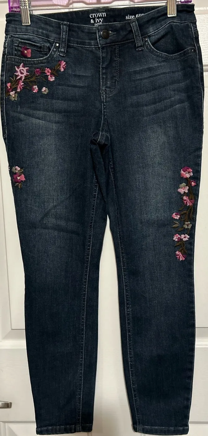 Crown & Ivy Petite Skinny Blue Jeans w/Floral Pink Embroidered Design Size 6PR 25" Inseam x 13" Wais... Show more