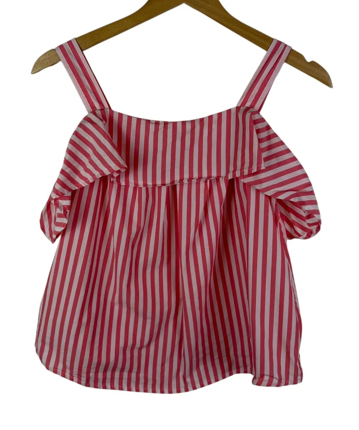 A charming pink and white striped cold shoulder top. This blouse features delicate ruffle detailing along the neckline and sleeves, a flattering button-front closure, and adjustable shoulder straps. Perfect for a casual day out or a relaxed brunch.