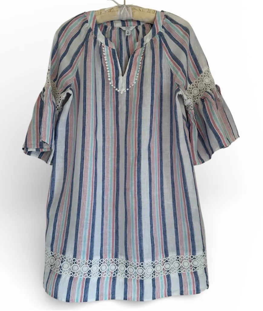 Crown & Ivy Shift DressPetite M Striped Bell Sleeves Crochet 100% Linen Boho Blue Size undefined - $26 - From April