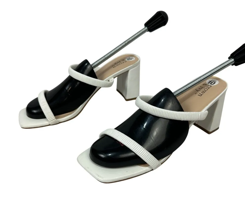 These stylish block heel sandals feature a modern design with versatile black and white tones, perfe... Show more