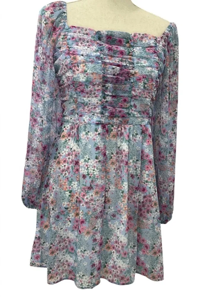 A stunning floral print chiffon dress in shades of light blue, pink, and purple. This Crystal Doll dress is a size Medium and in excellent, gently used condition. Features a square neckline, ruched detailing across the bust, and long, slightly puffed sleeves. The fit & flare shape creates a feminine silhouette. Perfect for date nights, parties, or any special event. Fully lined.